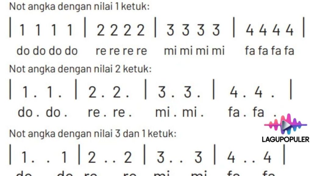 Namun, dalam konteks musik Indonesia, selain tangga nada mayor dan minor, dikenal pula tangga nada slendro dan pelog. Tangga nada slendro biasanya menggunakan lima nada utama, yaitu 1–2–3–5–6. Memahami tangga nada yang digunakan dalam sebuah lagu sangat penting agar pembacaan notasi angka menjadi tepat dan tidak keliru.
